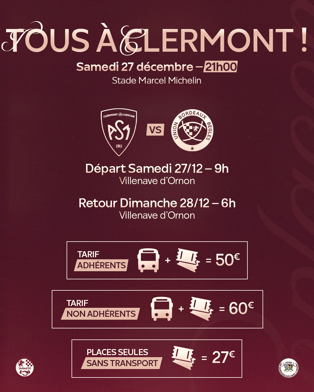 Les clubs de supporters des United BB et des Burdigalais vous invitent à vous joindre au déplacement à Clermont du samedi 27 décembre prochain.