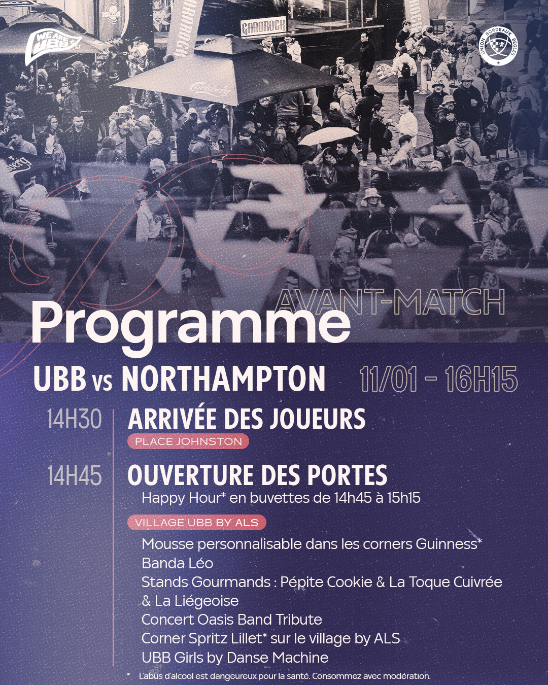 Le bus de l'UBB déposera les joueurs Place Johnston autour de 14h45, pour qu'ils parcourent les derniers mètres au plus proche de vous, avec speaker et DJ à partir de 14h30. Venez partager ce moment privilégié !