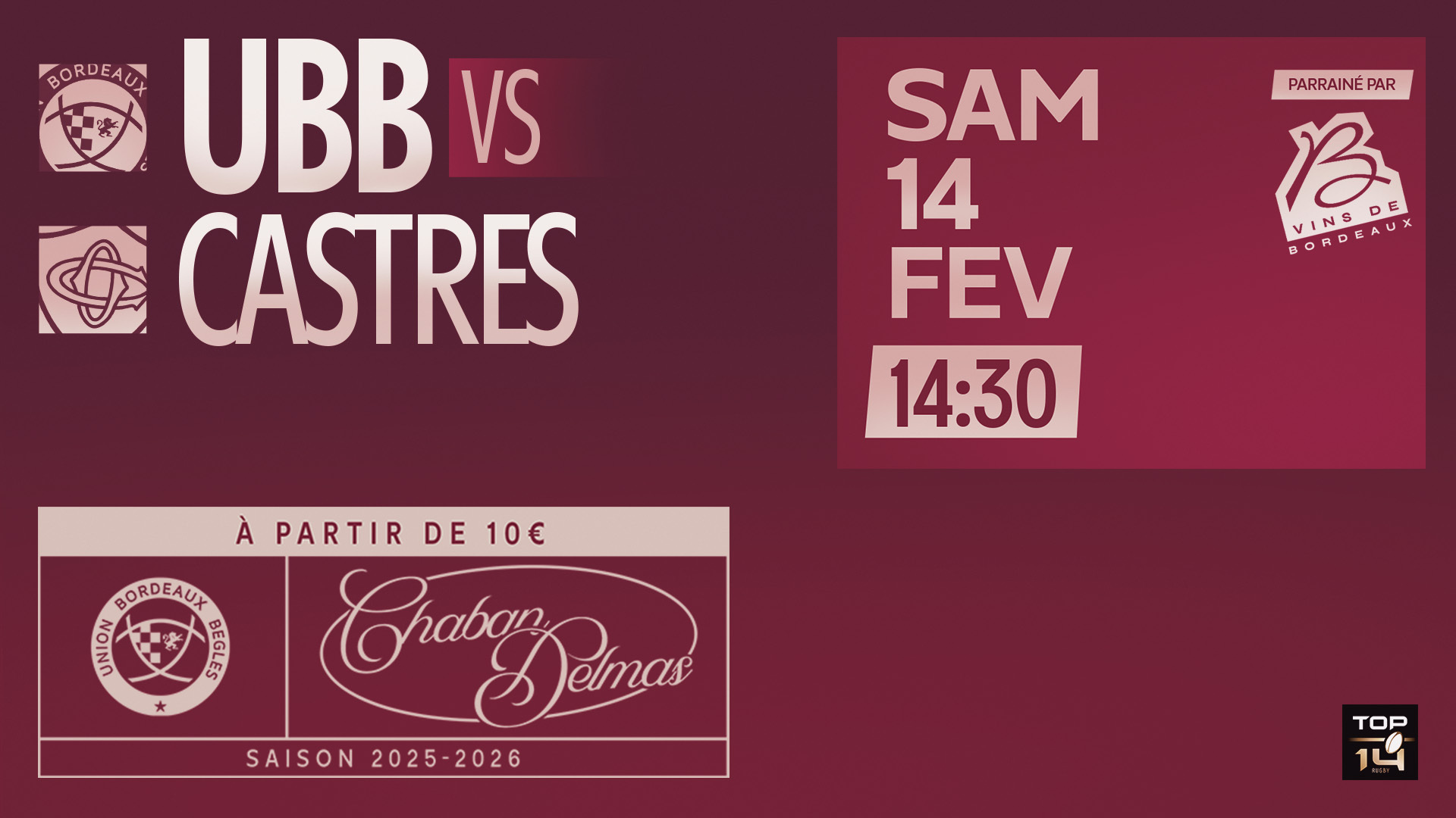 La billetterie est désormais ouverte pour la réception du Castres Olympique à Chaban ! Réservez vite vos places pour la J17 du TOP 14 !