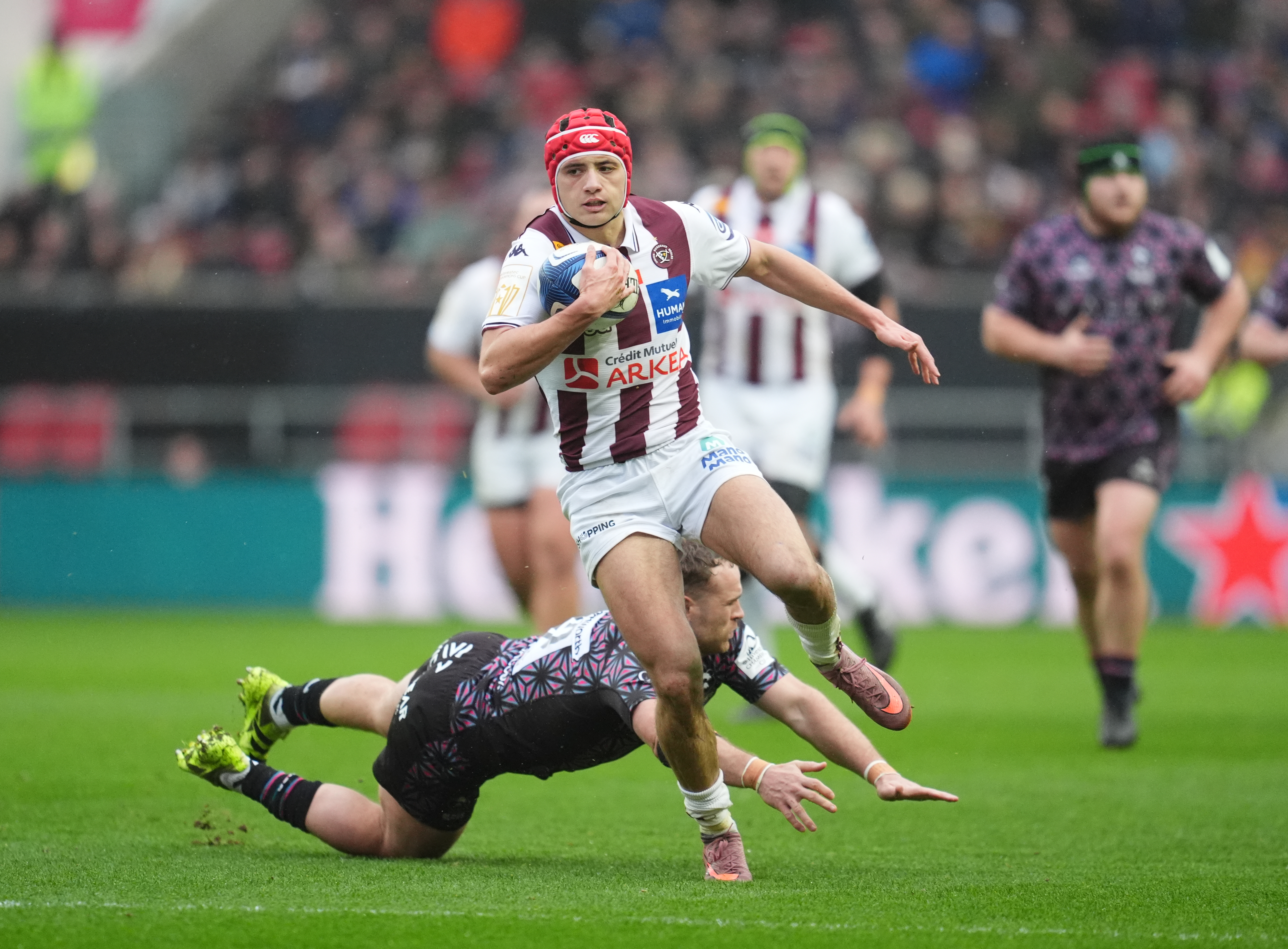 Les deux formations se rendaient ensuite coup pour coup mais à la 22e minute ce sont les girondins qui trouvaient de nouveau la solution : sur un ballon égaré par les anglais, Martin Page-Relo jouait parfaitement un deux contre deux et décalait Louis Bielle-Biarrey dans son couloir, qui s'en allait inscrire un doublé (22e ; 5-12 après transformation de M.Jalibert).