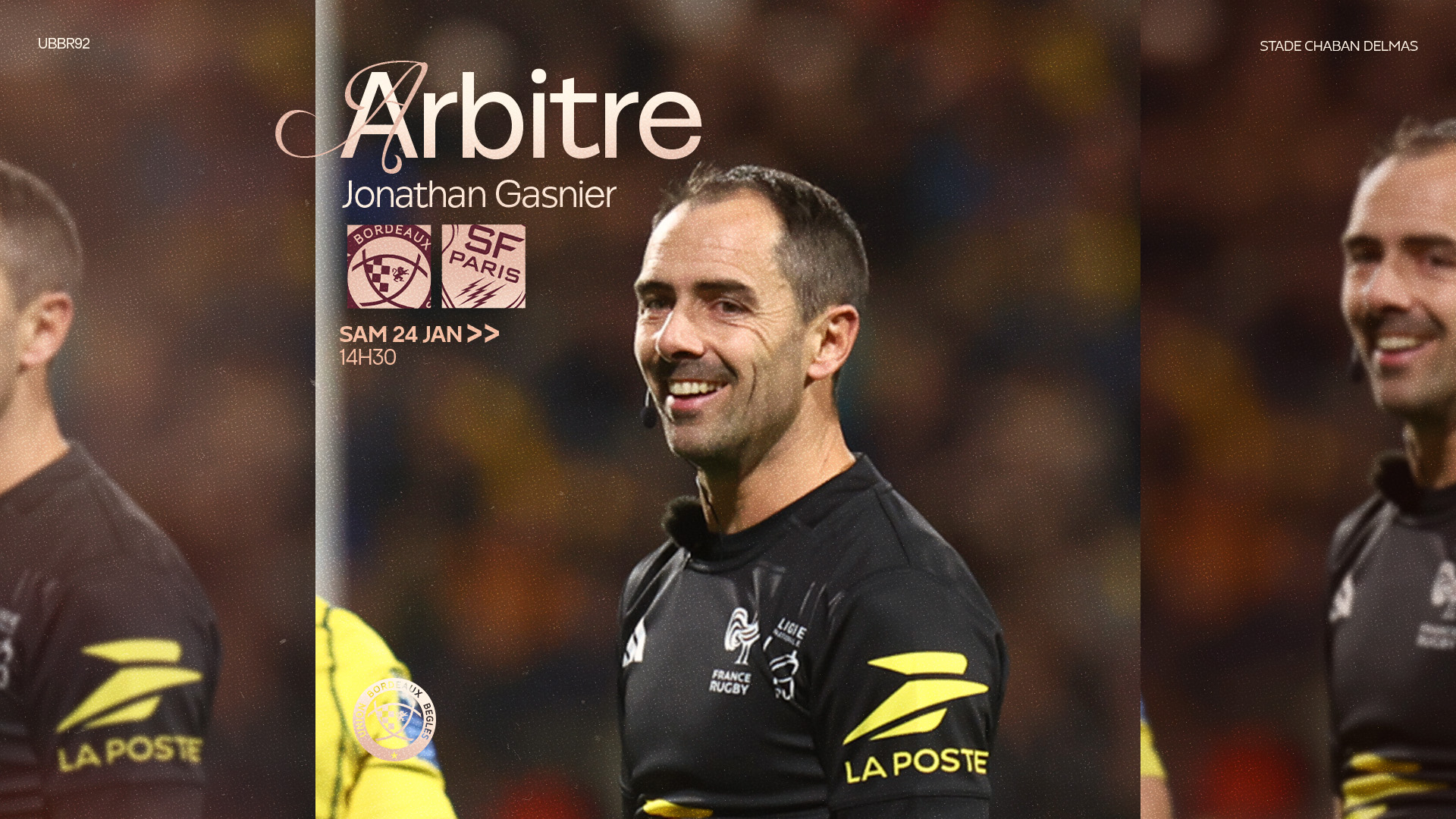 Ce samedi, l'UBB reçoit le Stade Français Paris à 14h30 au Stade Chaban Delmas. Voici le corps arbitral de cette rencontre :