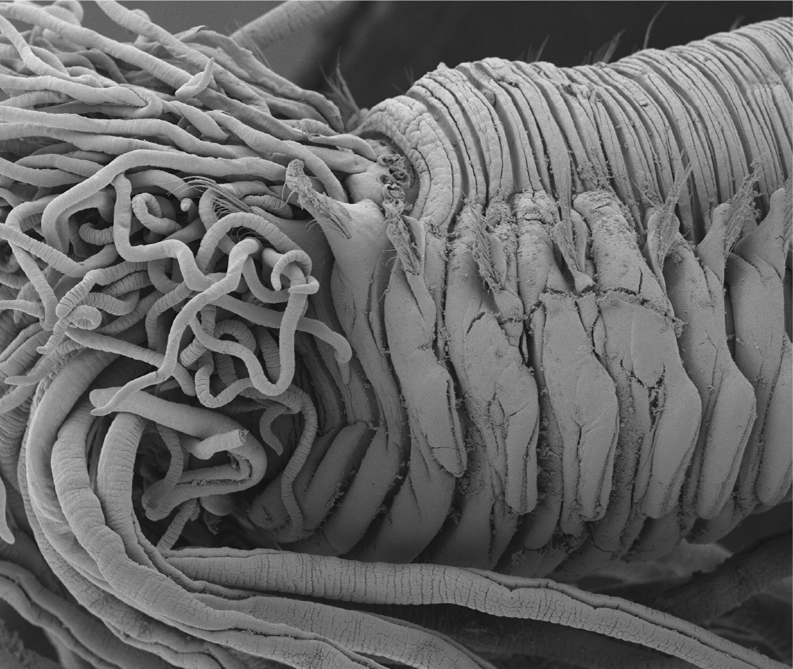 Voici une photo du Thelephus Ubebe Les fils fins sont ses branchies (pour respirer), les fils épais ses tentacules (pour se nourrir). Credit photo : Nicolas Lavesque