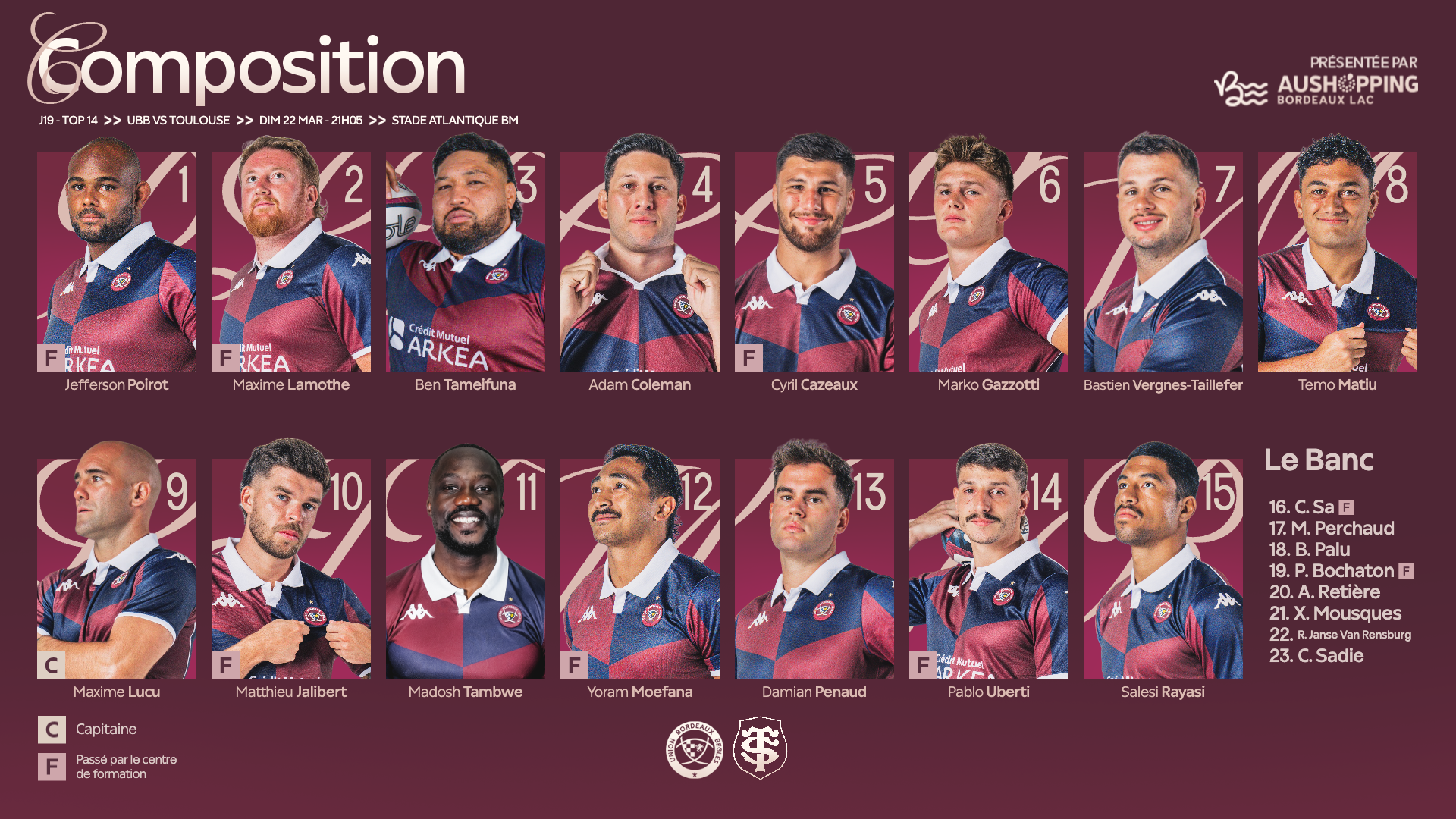 Après deux semaines de pause pour le Tournoi des Six Nations, le Top 14 reprend ses droits ce week-end sur la pelouse du Stade Atlantique BM. Nos Girondins retrouveront le Stade Toulousain demain à 21h05 pour le choc de la 19e journée. Voici la composition :