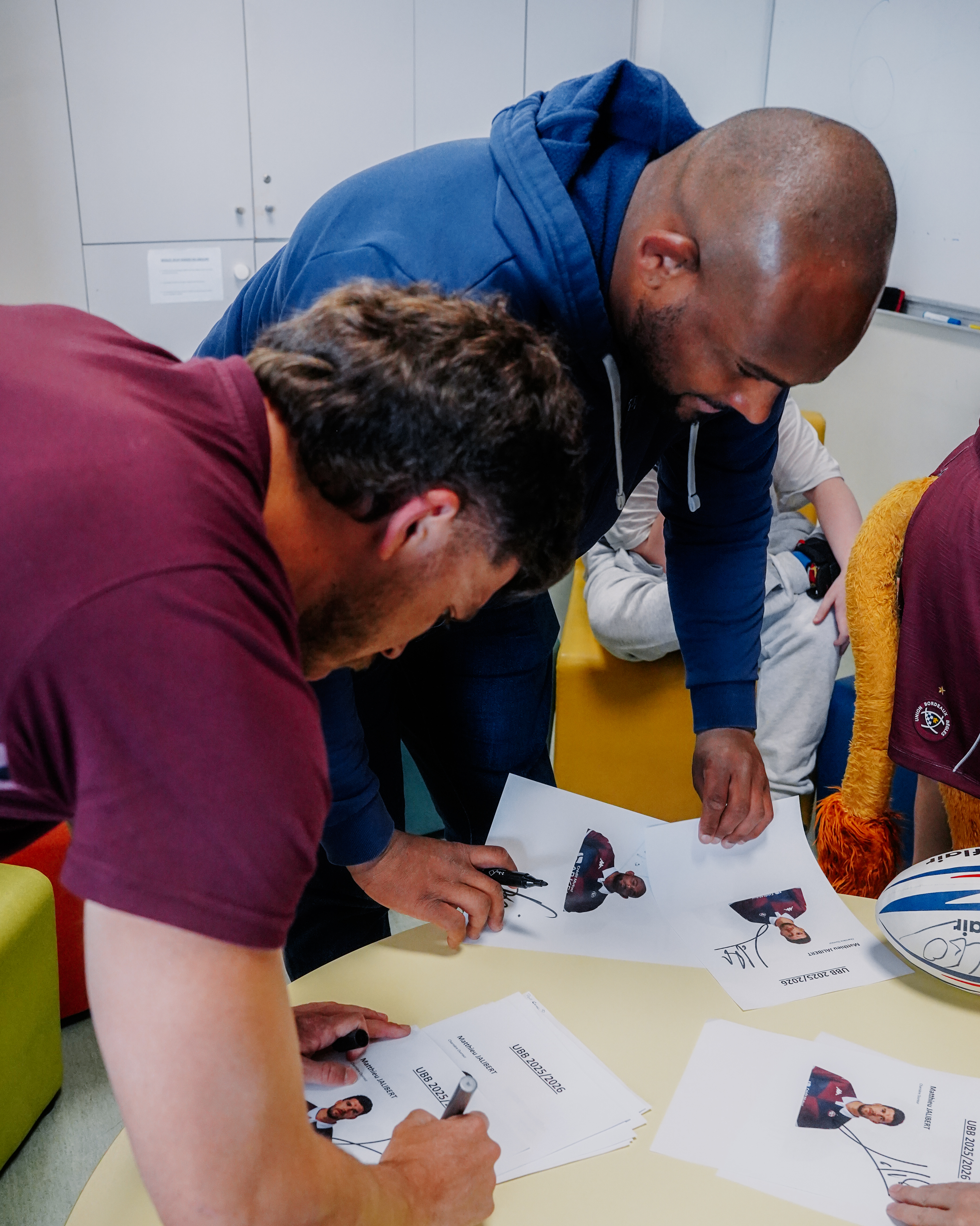 Partage et sourires à l'hôpital Jean Abadie. Quand Matthieu Jalibert et Jefferson Poirot rendent visite aux jeunes patients hospitalisés.