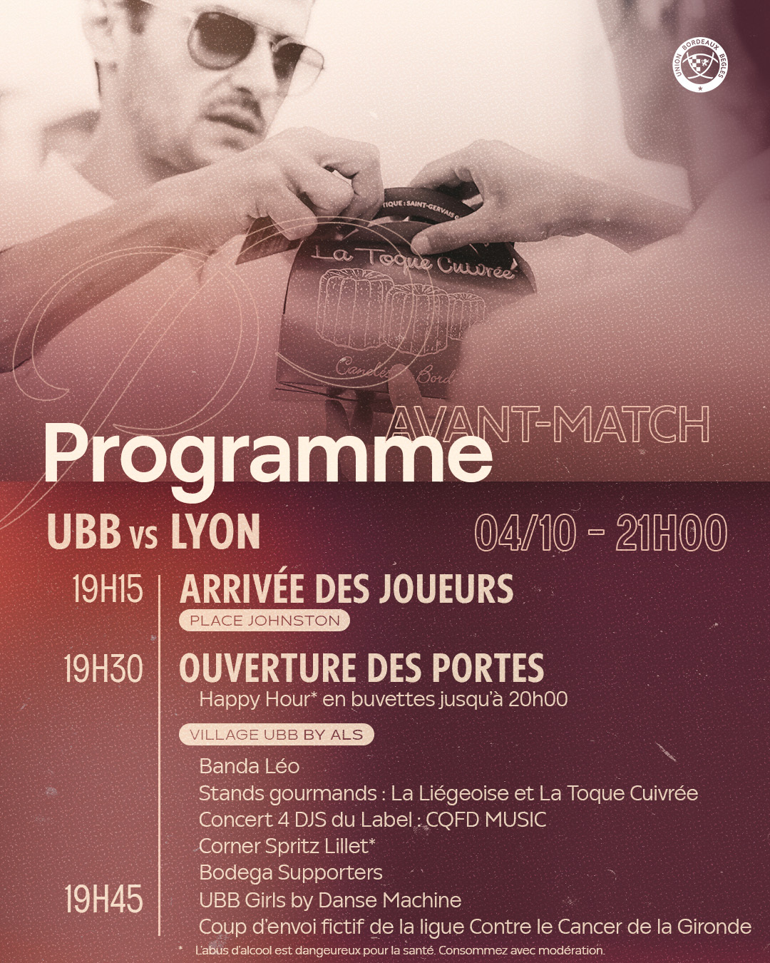 Le bus de l'UBB déposera les joueurs Place Johnston autour de 19h15, pour qu'ils parcourent les derniers mètres au plus proche de vous, avec speaker et DJ à partir de 19h. Venez partager ce moment privilégié !
