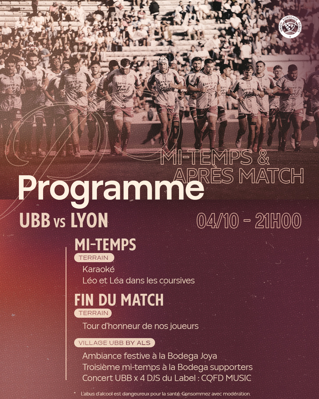 Un troisième match à domicile pour l'UBB qui affrontera les Lyonnais à 21h. En raison de la forte affluence attendue, pensez à anticiper votre arrivée au stade !