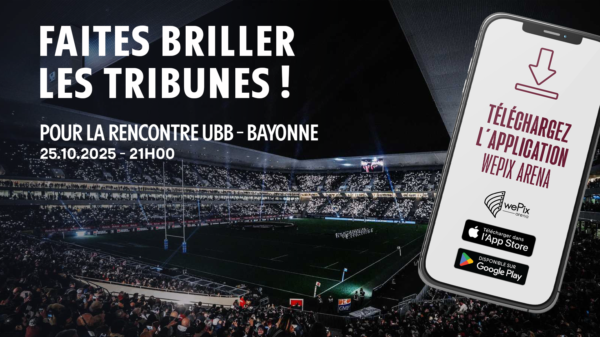 Vous avez été nombreux à participer l'an dernier, venez nous aider à faire briller le Stade Atlantique avec WePix Arena ! Téléchargez l'application WePix Arena et sélectionnez l'évènement UBB / Bayonne. Un spectacle lumineux exclusif se lancera avant le coup d'envoi du match !