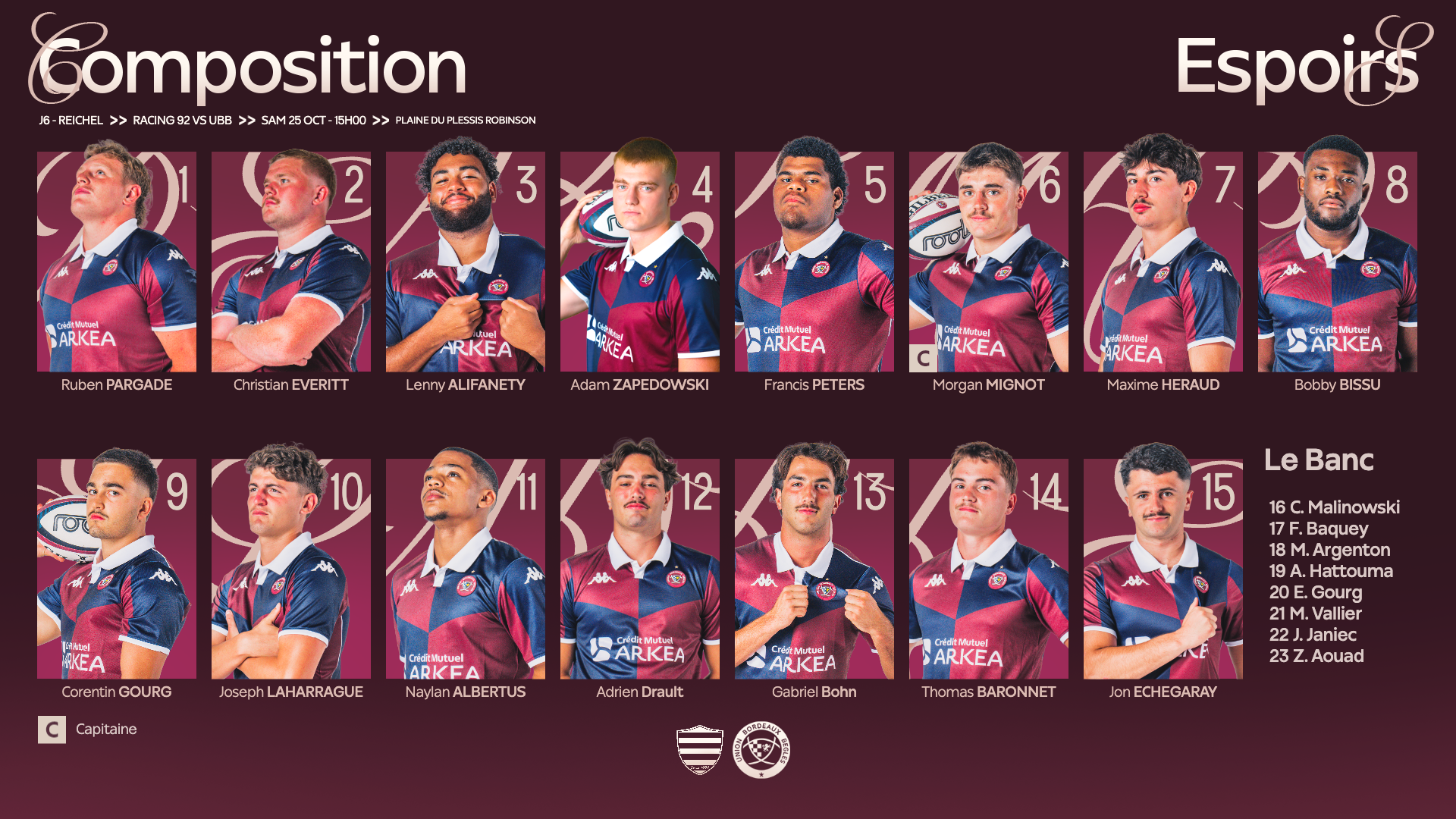 Première journée de la phase retour des matchs préliminaires pour nos Espoirs, qui se déplaceront chez les premiers de la poule, le Racing 92, ce samedi 25 octobre 2025. Voici la composition :
