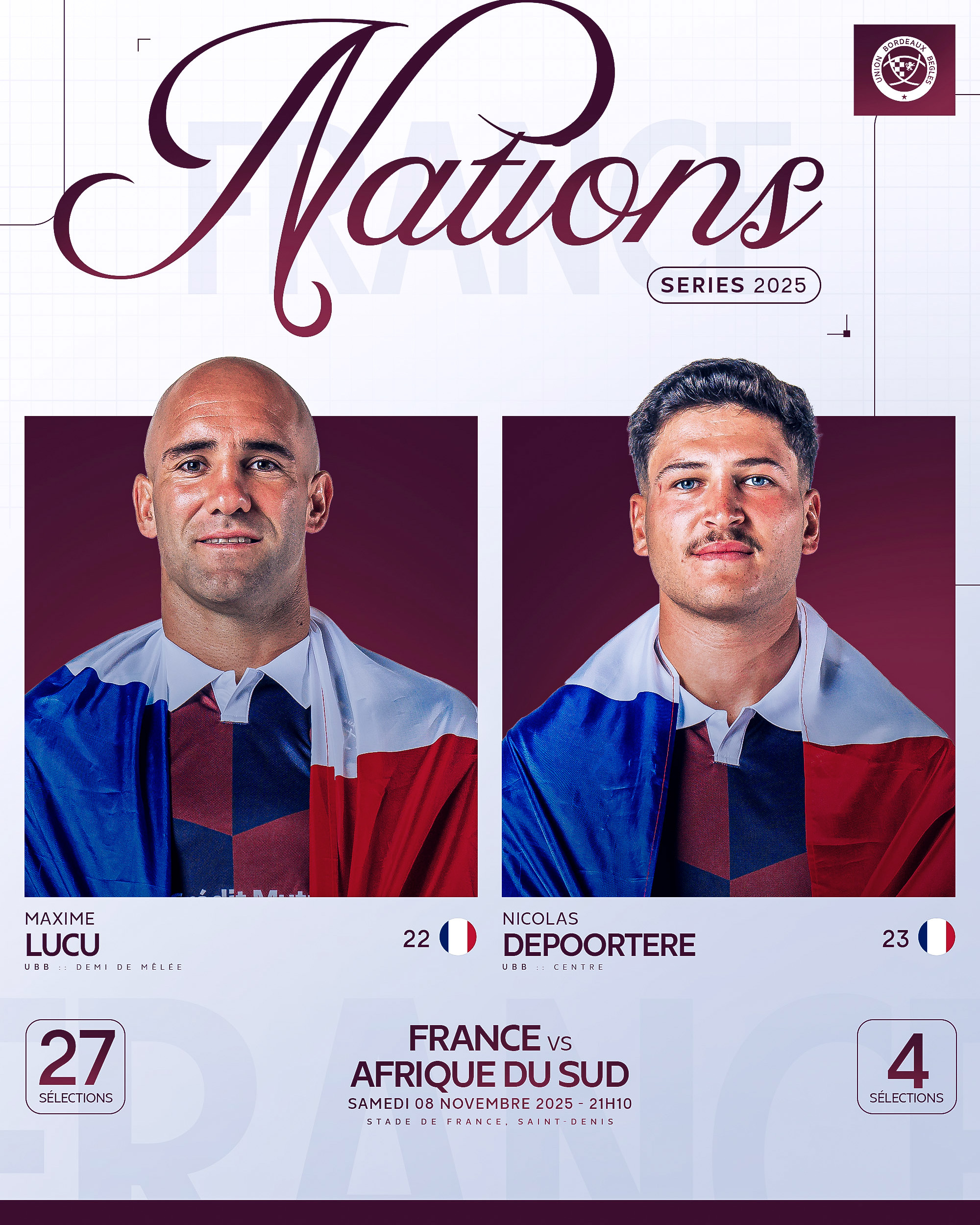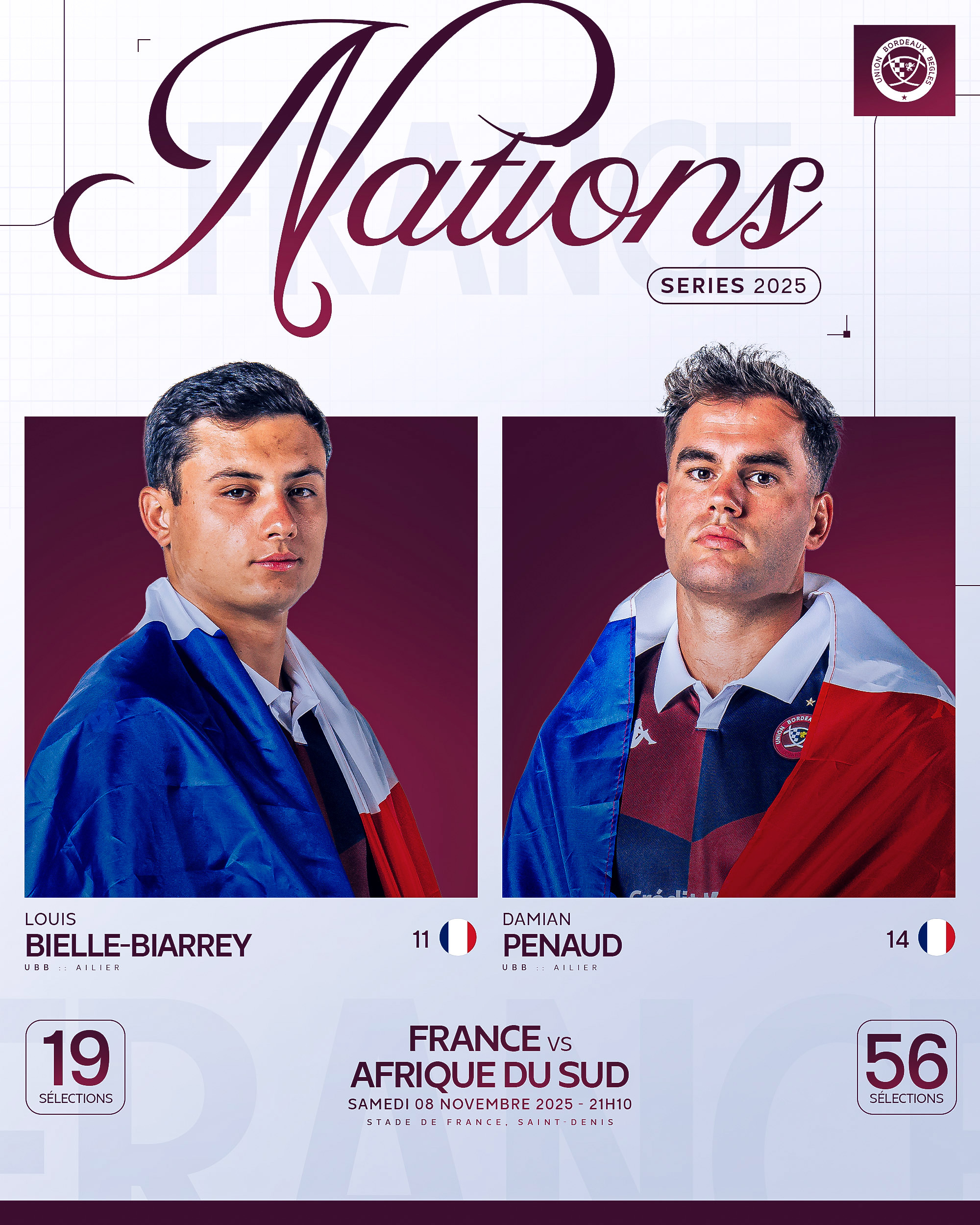Nos deux ailiers : Louis Bielle-Biarrey (19 sélections, 18 essais) et Damian Penaud (56 sélections, 38 essais) commenceront sur les ailes alors que Maxime Lucu (27 sélections) et Nicolas Depoortere (4 sélections) feront partie des "finisseurs" chargés de faire la différence en fin de match !