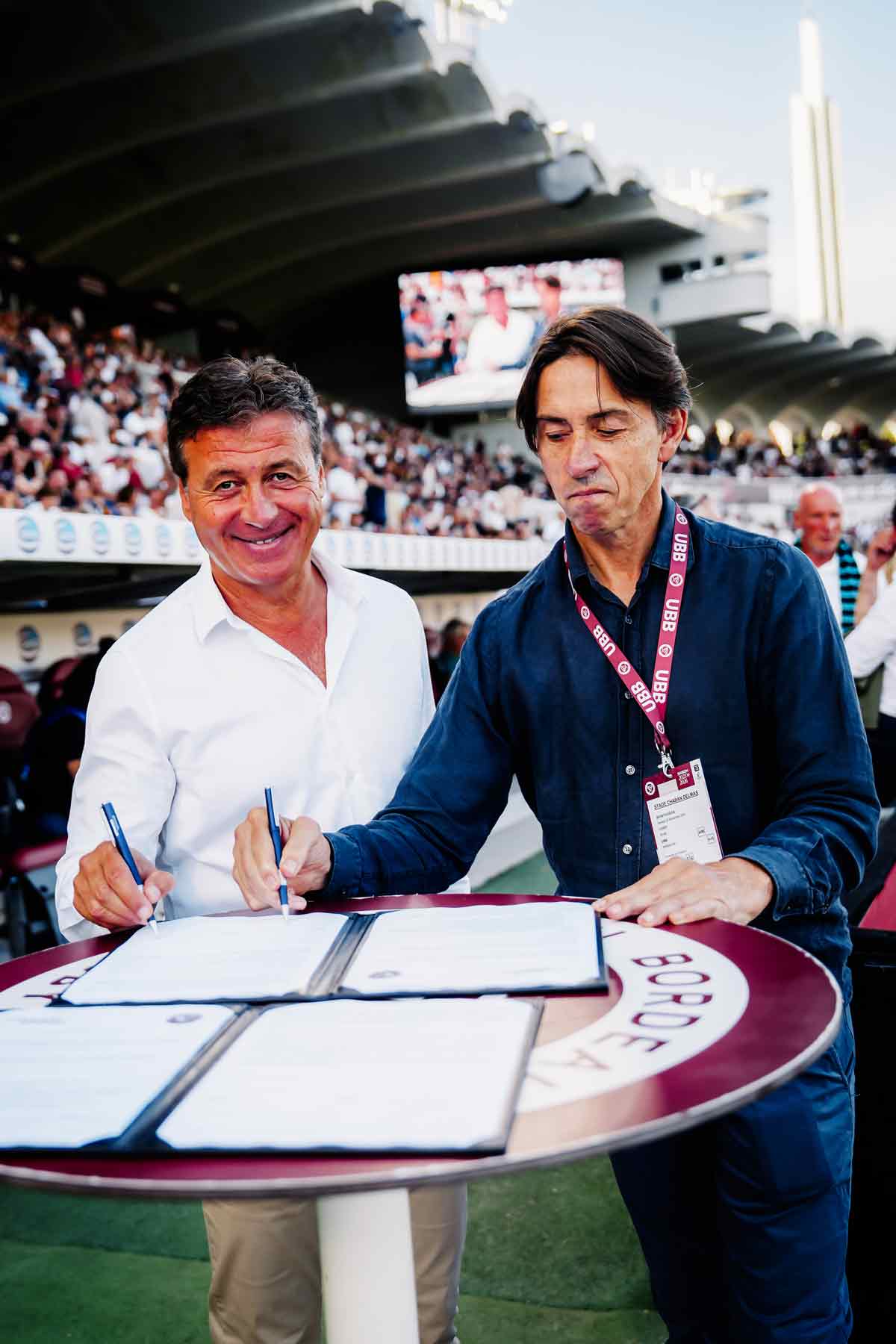 À l'occasion du match face à Montauban ce samedi, l'UBB et l'Université de Bordeaux ont officialisé le renouvellement de la convention qui les unit depuis 2015. Une prolongation de 5 ans, symboliquement signée en bord du terrain de Chaban par Laurent Marti, président de l'Union Bordeaux Bègles, et Dean Lewis, président de l'Université de Bordeaux.