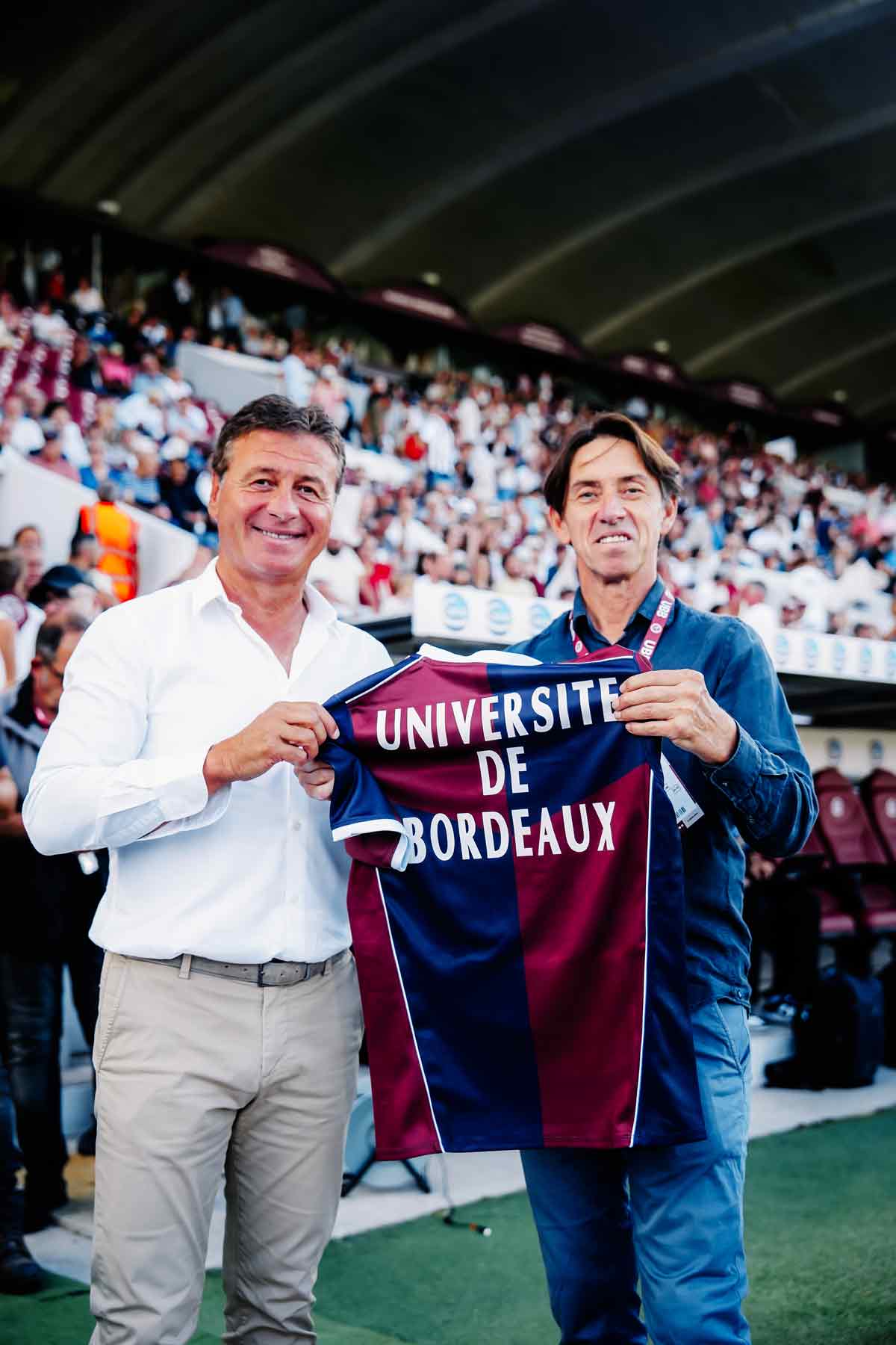Dean Lewis, président de l'Université de Bordeaux, s'est vu remettre un maillot par le président de l'UBB Laurent Marti.
