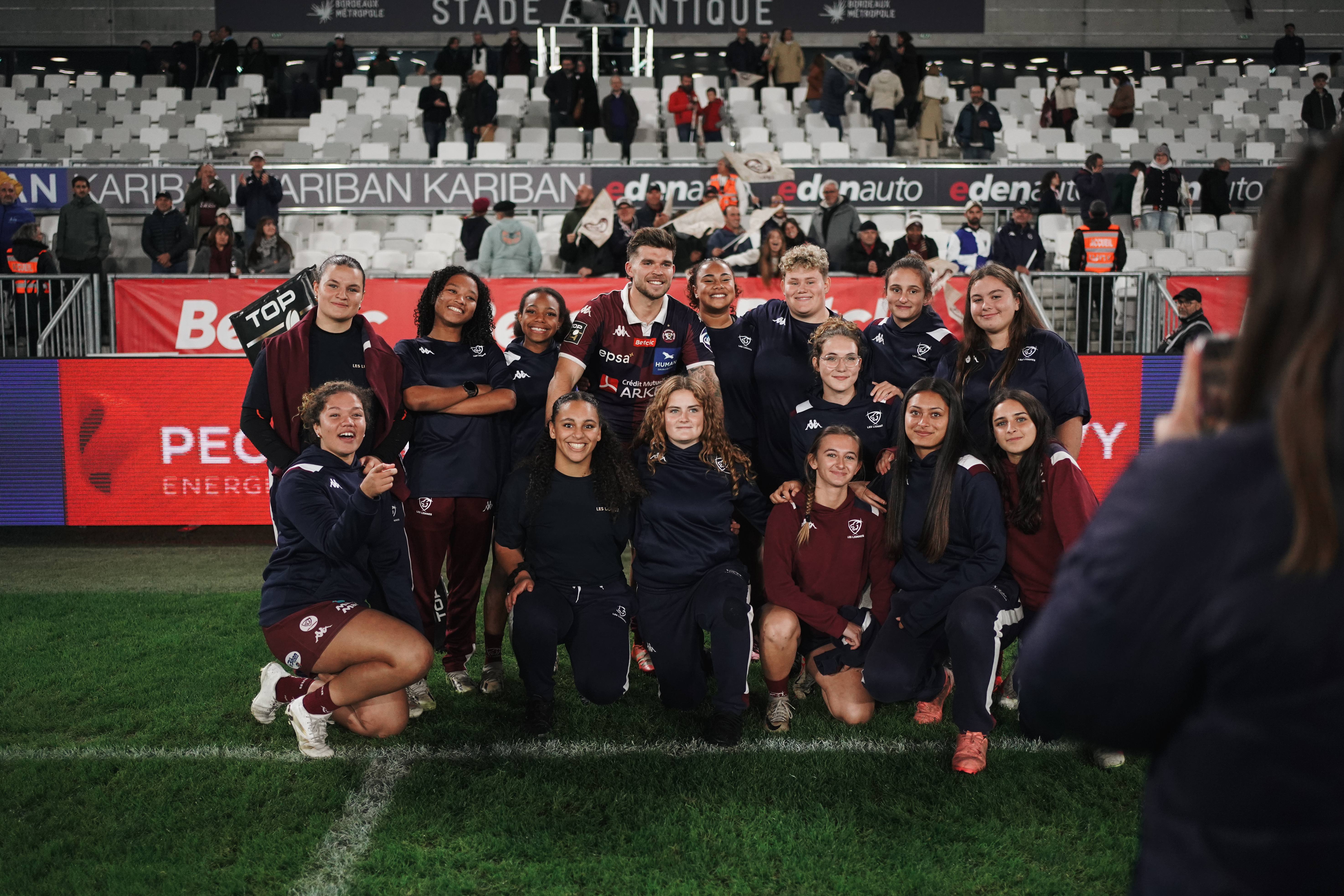Les cadettes du stade bordelais prennent la pose avec Matthieu Jalibert